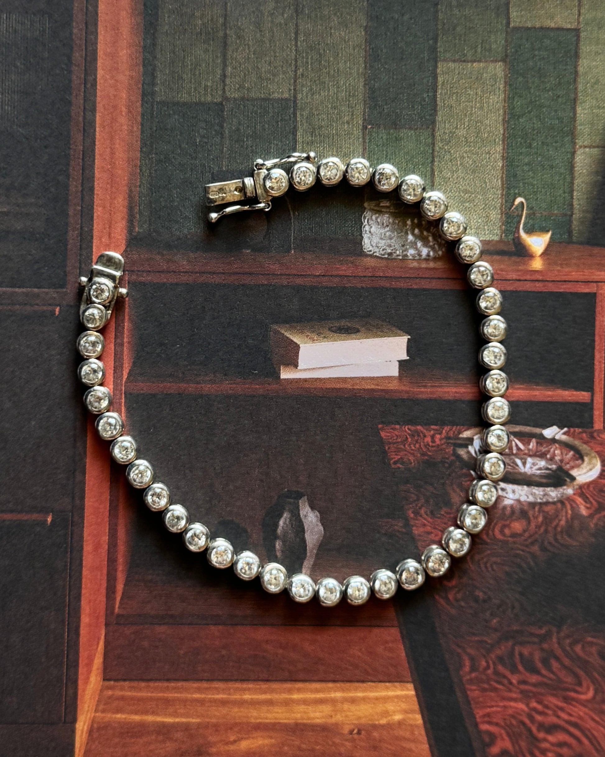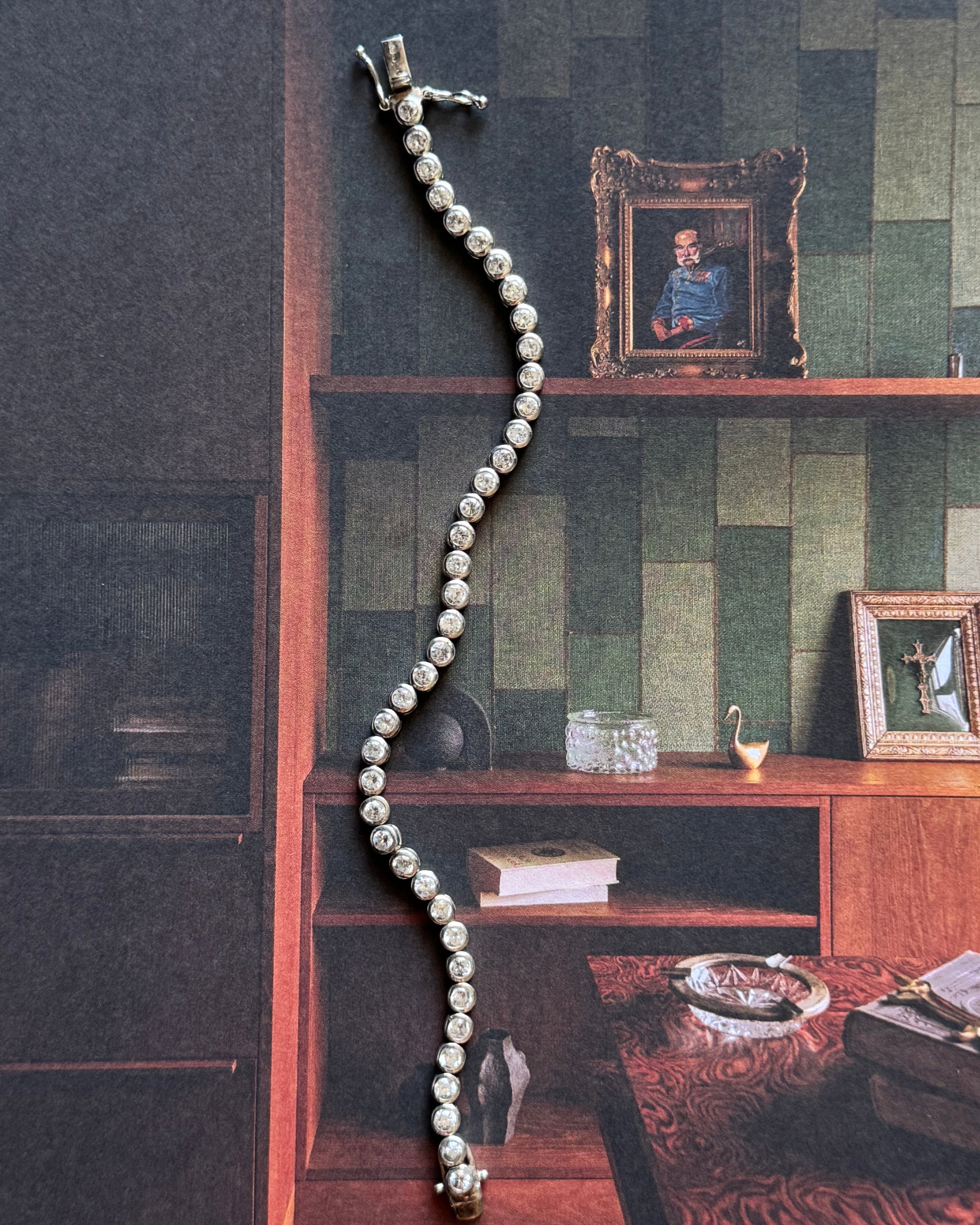 Elegancka bransoletka typu tennis, wykonana ze srebra próby 925 i wysadzana rzędem jasnych, fasetowanych cyrkoni w pełnej oprawie typu bezel. Ten ponadczasowy wzór, spopularyzowany w latach 80. i na stałe wpisany do kanonu klasycznej biżuterii, łączy subtelną formę z wyraźnym blaskiem.