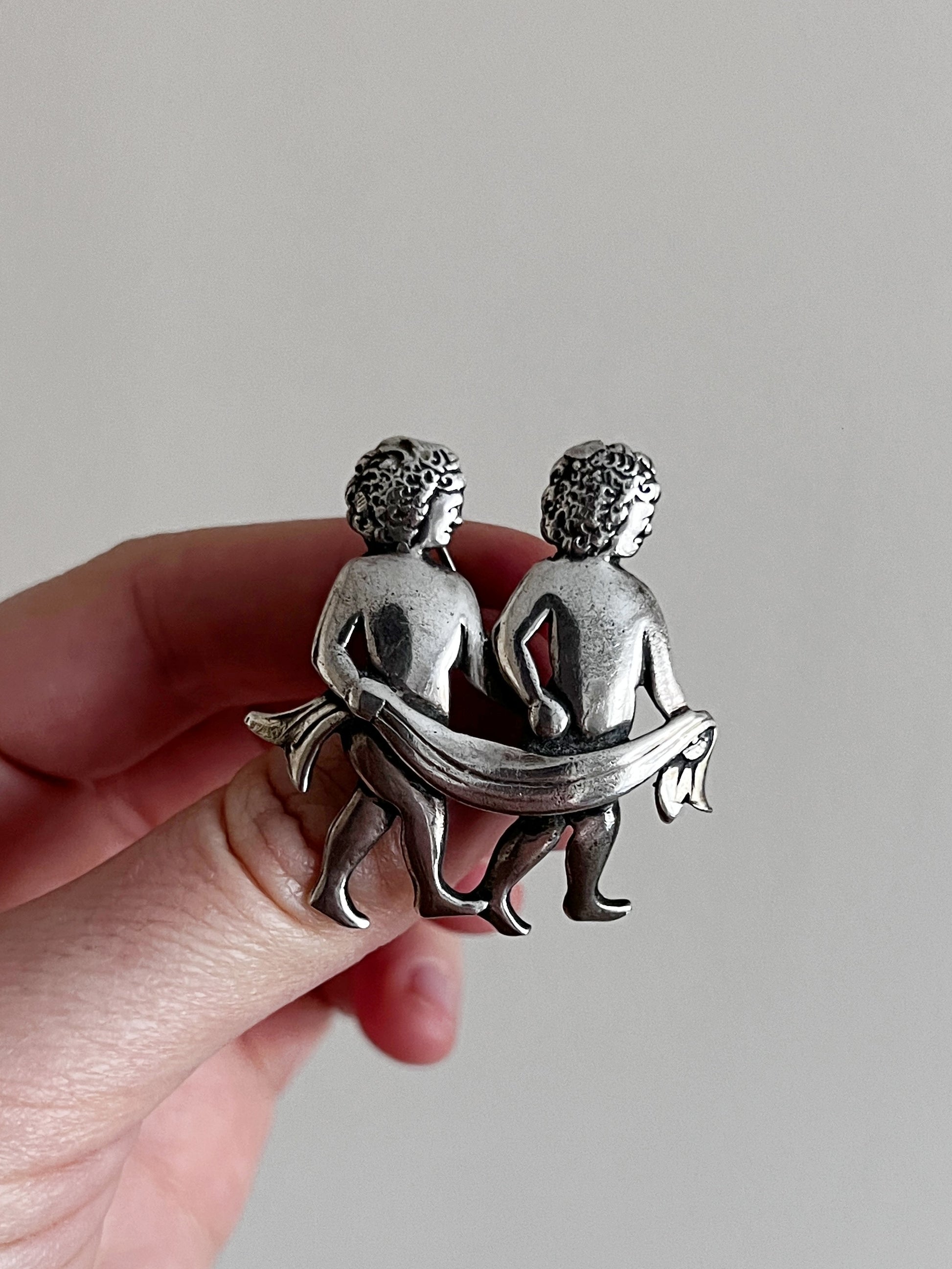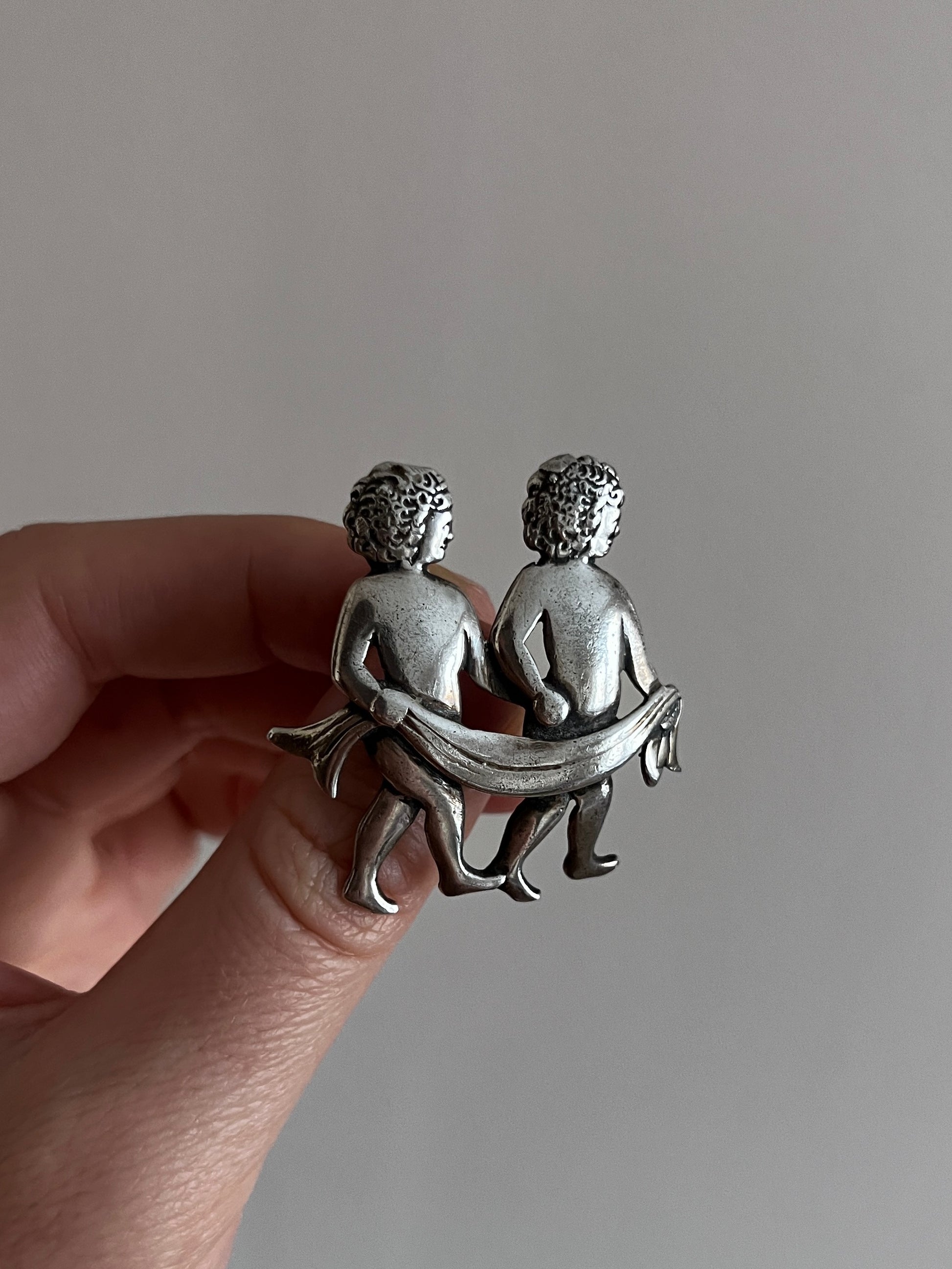 Stylowa, figlarna brosza wykonana ze srebra to artystyczna interpretacja znaku zodiaku Bliźniąt – jednego z najbardziej rozpoznawalnych i symbolicznie bogatych w całej astrologii. Dwójka nagich postaci, dyskretnie owiniętych tkaniną, to klasyczne przedstawienie mitologicznych braci Kastora i Polluksa. Znak ten od wieków kojarzony był z podwójną naturą, elokwencją, ruchem i ciekawością – a także z równowagą pomiędzy światłem a cieniem. W tej wersji z lekkim przymrużeniem oka, postaci przypominają nieco putta z renesansowych dekoracji lub bohaterów z kreskówki – to biżuteria z duszą i dystansem.