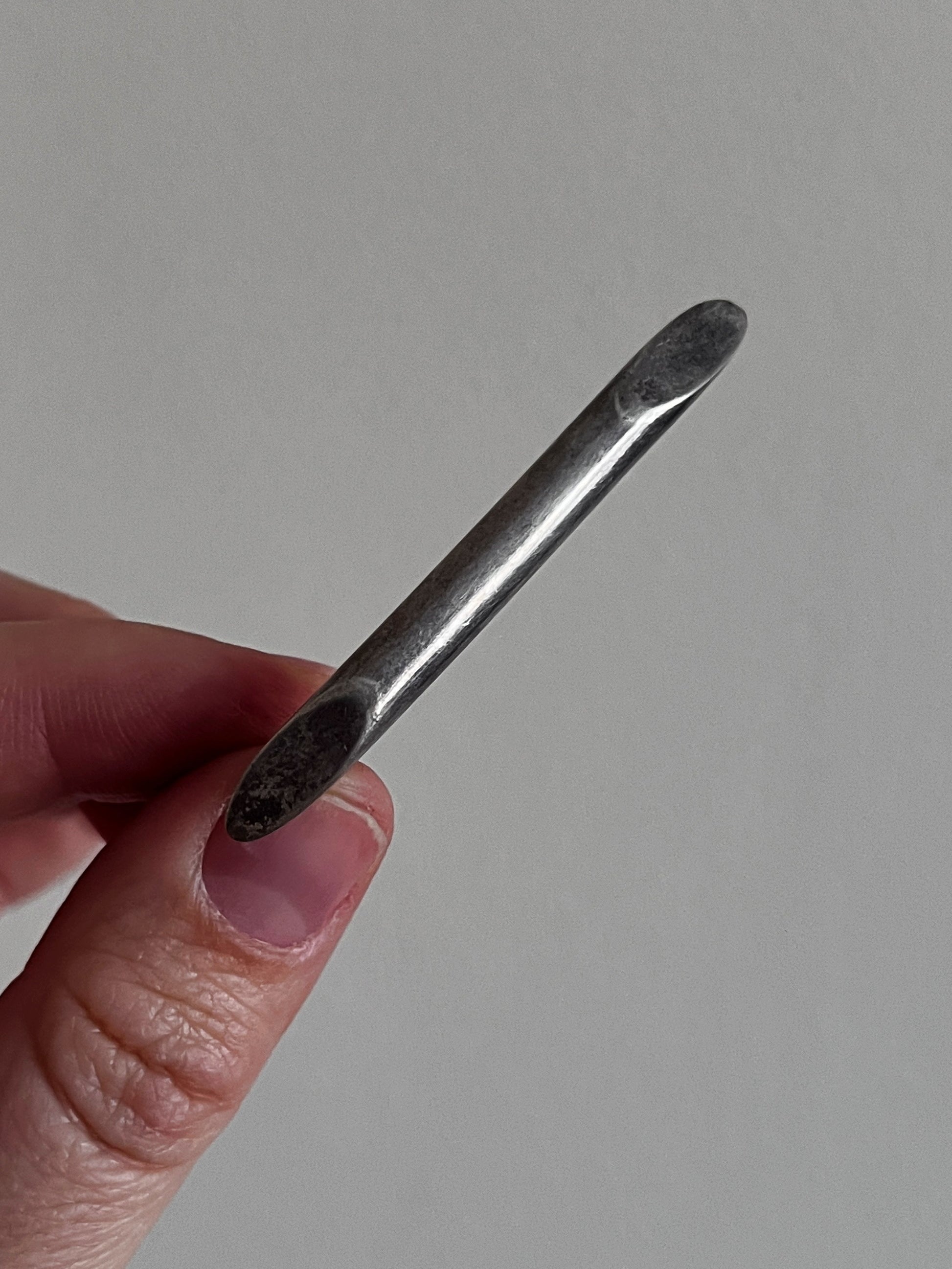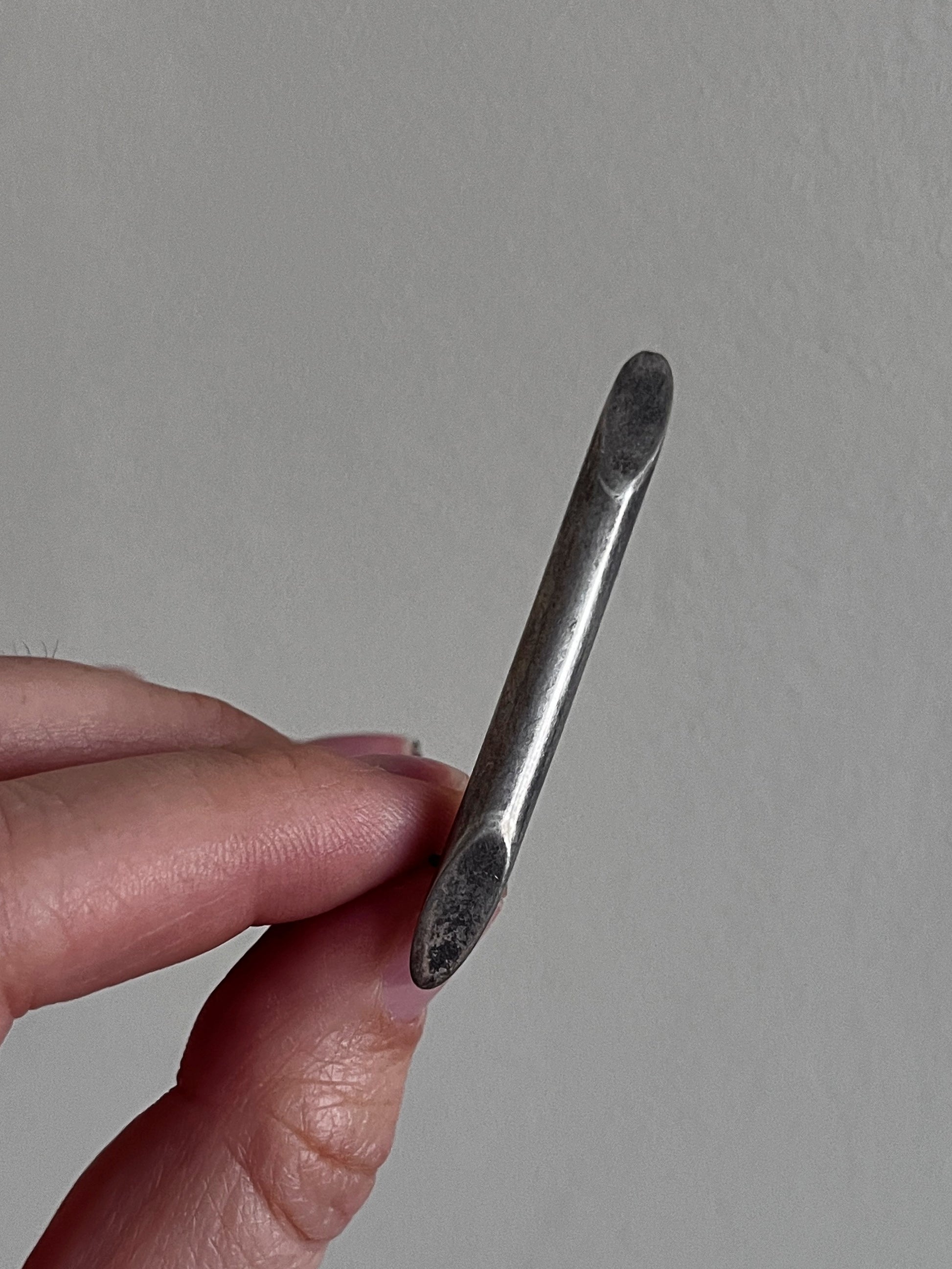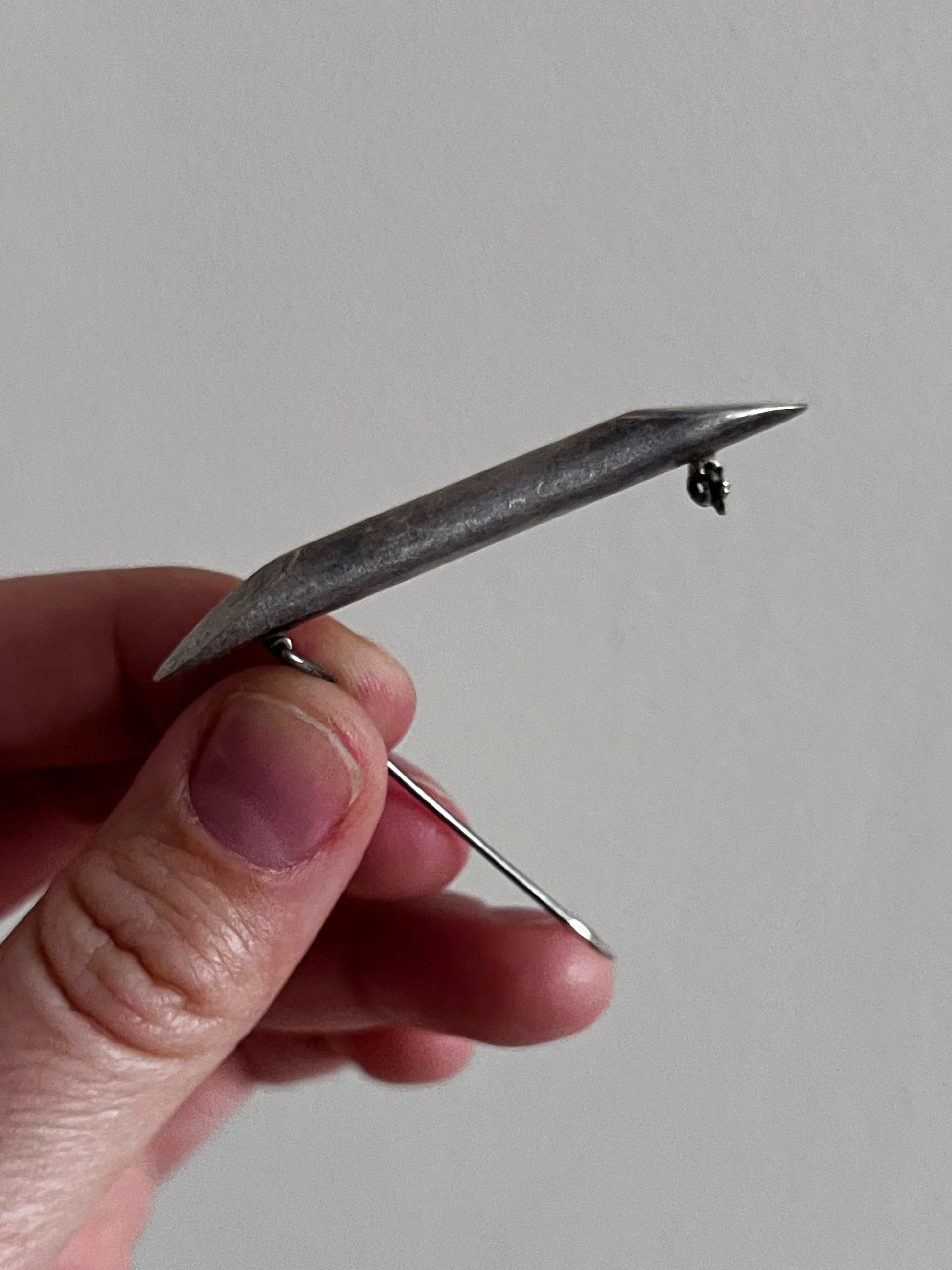 Na pierwszy rzut oka może wydawać się skromna, ale właśnie w tej oszczędności formy tkwi jej siła. Srebrna broszka o wydłużonym kształcie z delikatnie zaokrąglonymi końcami to esencja modernistycznego podejścia do biżuterii – żadnych zbędnych ornamentów, czysta forma, która staje się ozdobą samą w sobie. Tego typu przedmioty powstawały głównie w drugiej połowie XX wieku, często w warsztatach rzemieślniczych Europy Północnej, gdzie funkcjonalizm łączył się z artystycznym wyczuciem.
