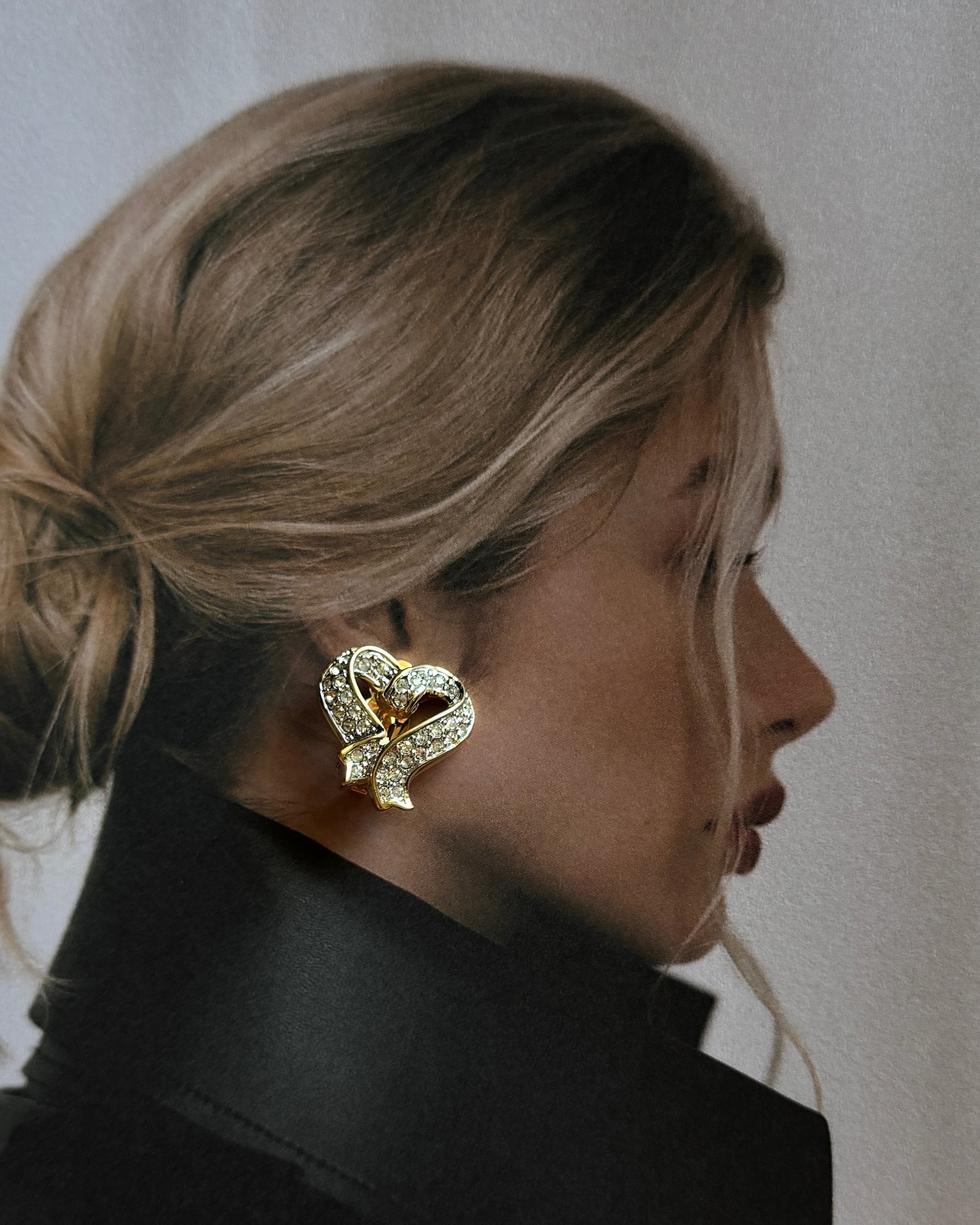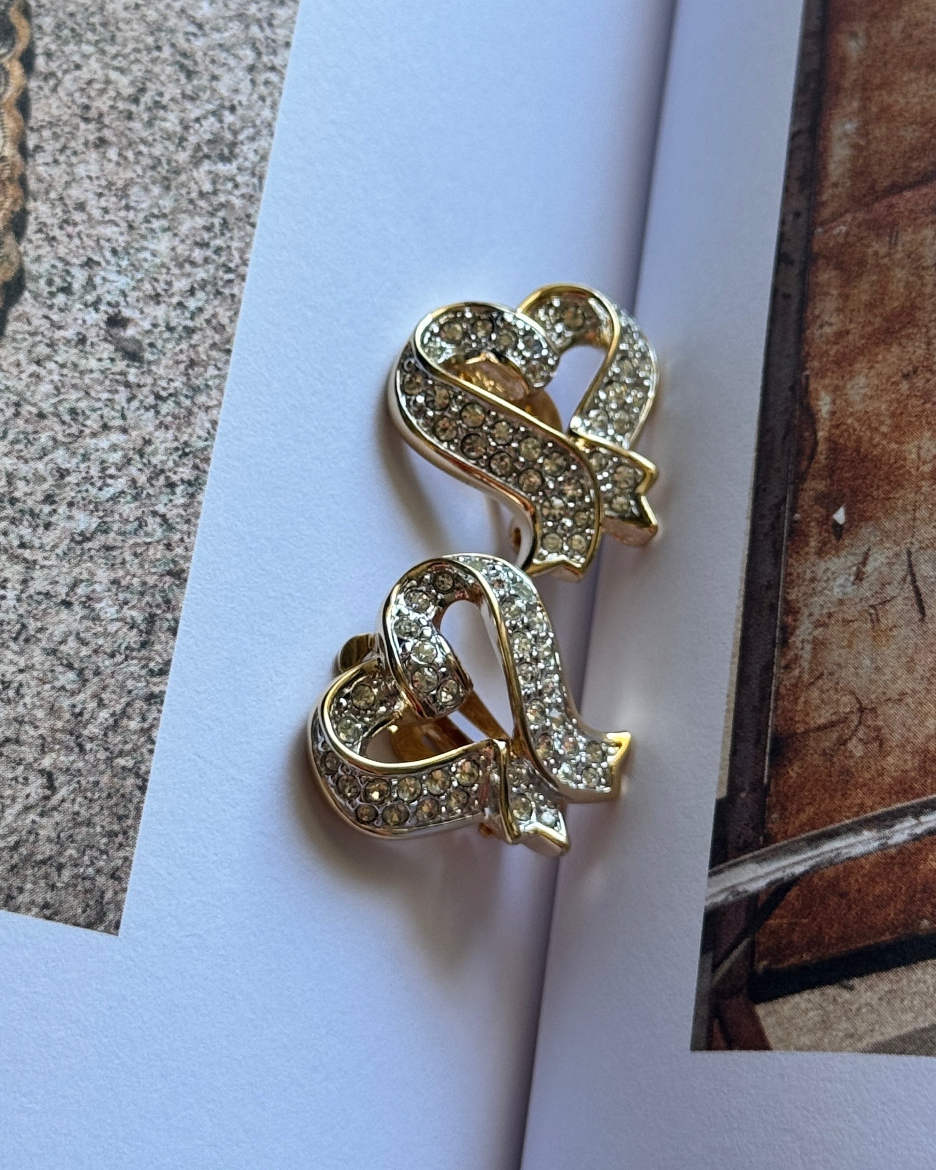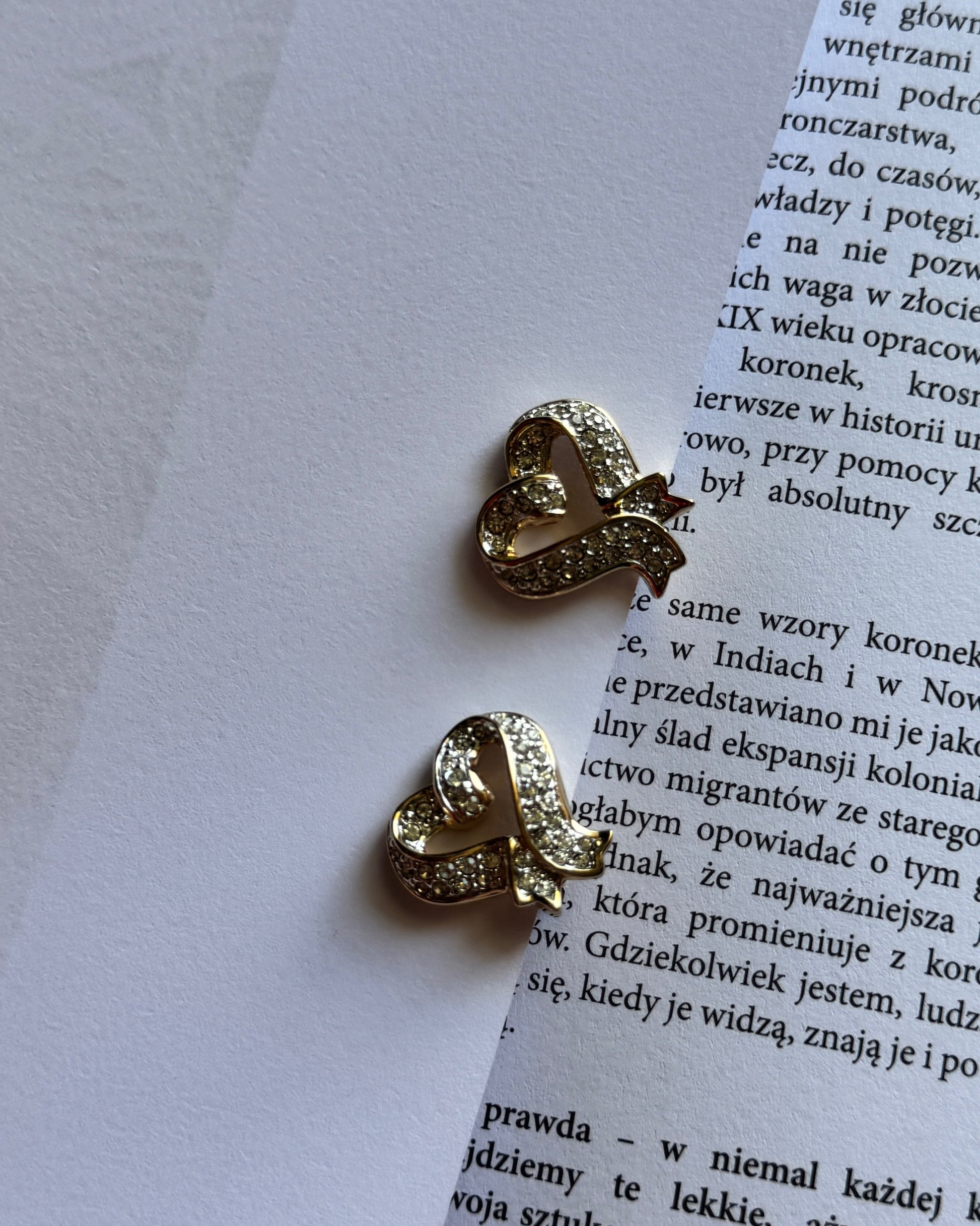 Romantyczne kolczyki vintage w kształcie stylizowanych serc, wysadzane jasnymi kryształami, które pięknie odbijają światło. Wykonane ze złoconego metalu, mają formę serca splecionego z wstęgą, co nadaje im miękki, dekoracyjny charakter typowy dla biżuterii lat 80. i 90.