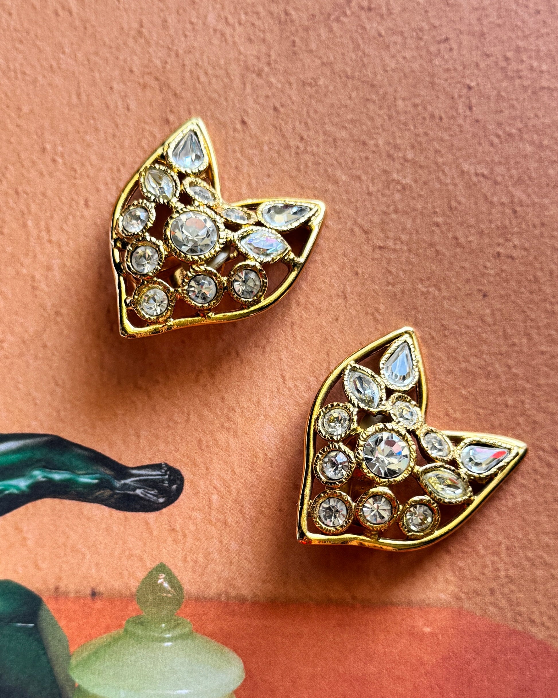 Olśniewające kolczyki vintage marki Swarovski, utrzymane w eleganckiej formie przypominającej liść lub stylizowane serce. Wykonane ze złoconego metalu i wysadzane jasnymi kryształami w różnych szlifach – okrągłym, gruszkowym i markizy – tworzą pełen blasku, geometryczny wzór.