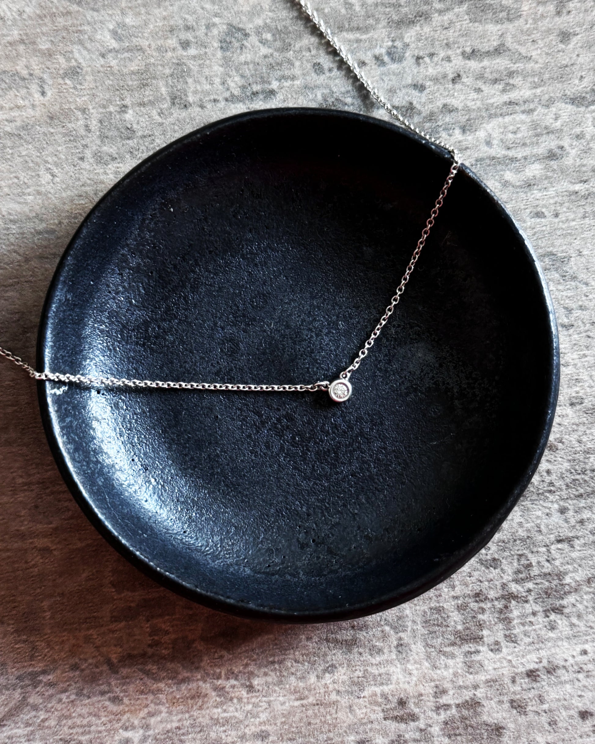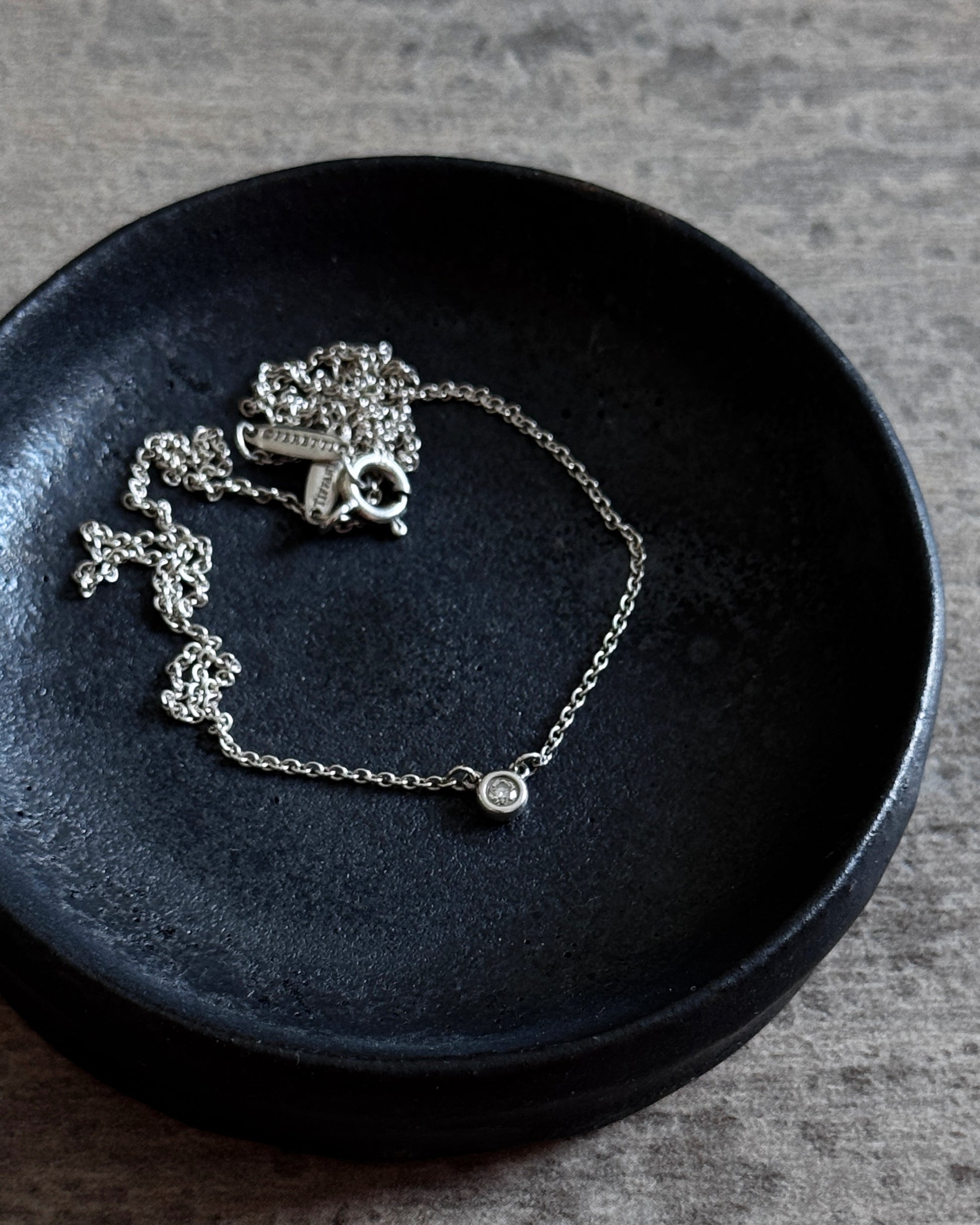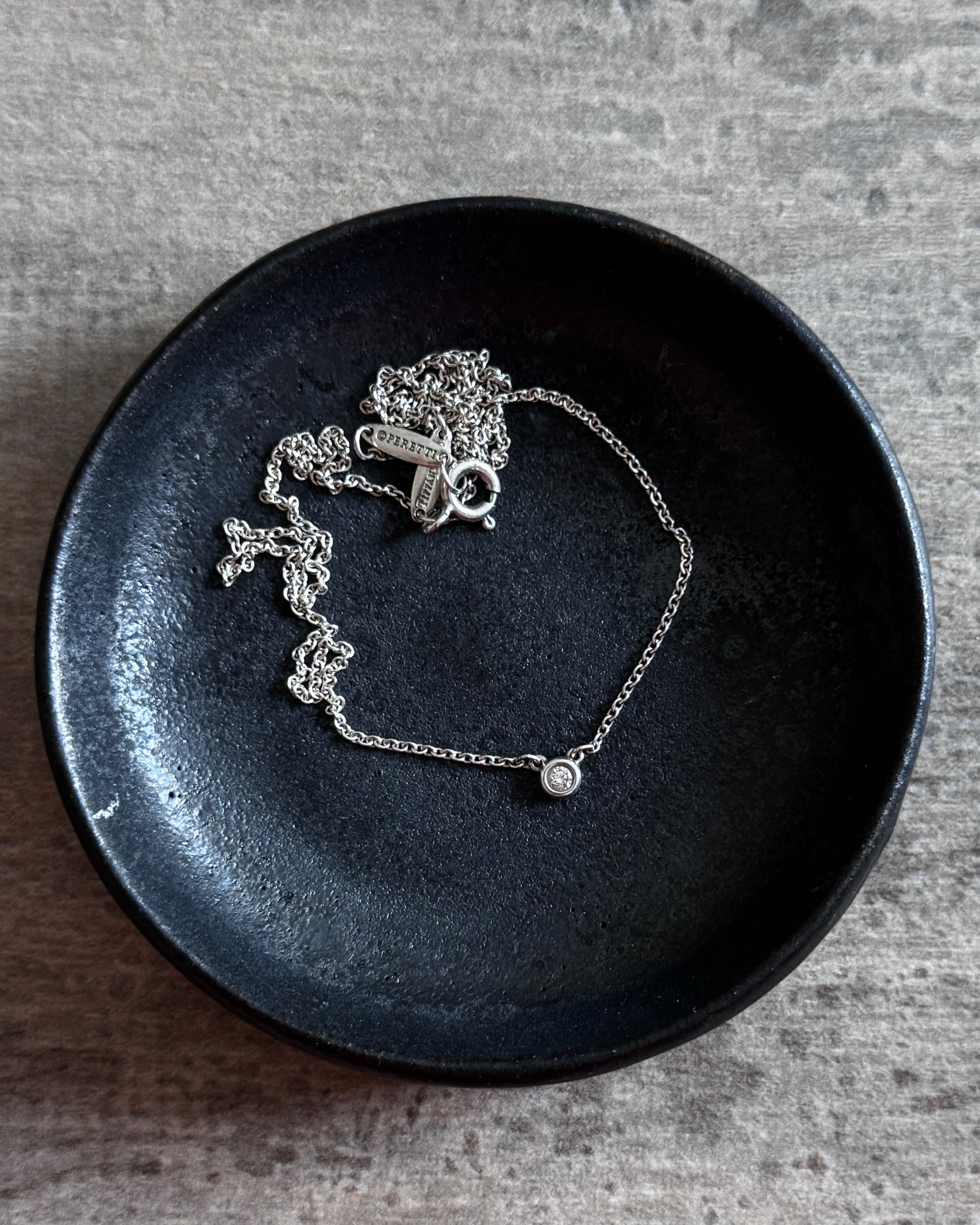 Pojedynczy brylant, albo inaczej - okrągły diament w szlifie brylantowym lśni w centrum tego minimalistycznego naszyjnika zaprojektowanego przez Elsę Peretti dla Tiffany & Co.