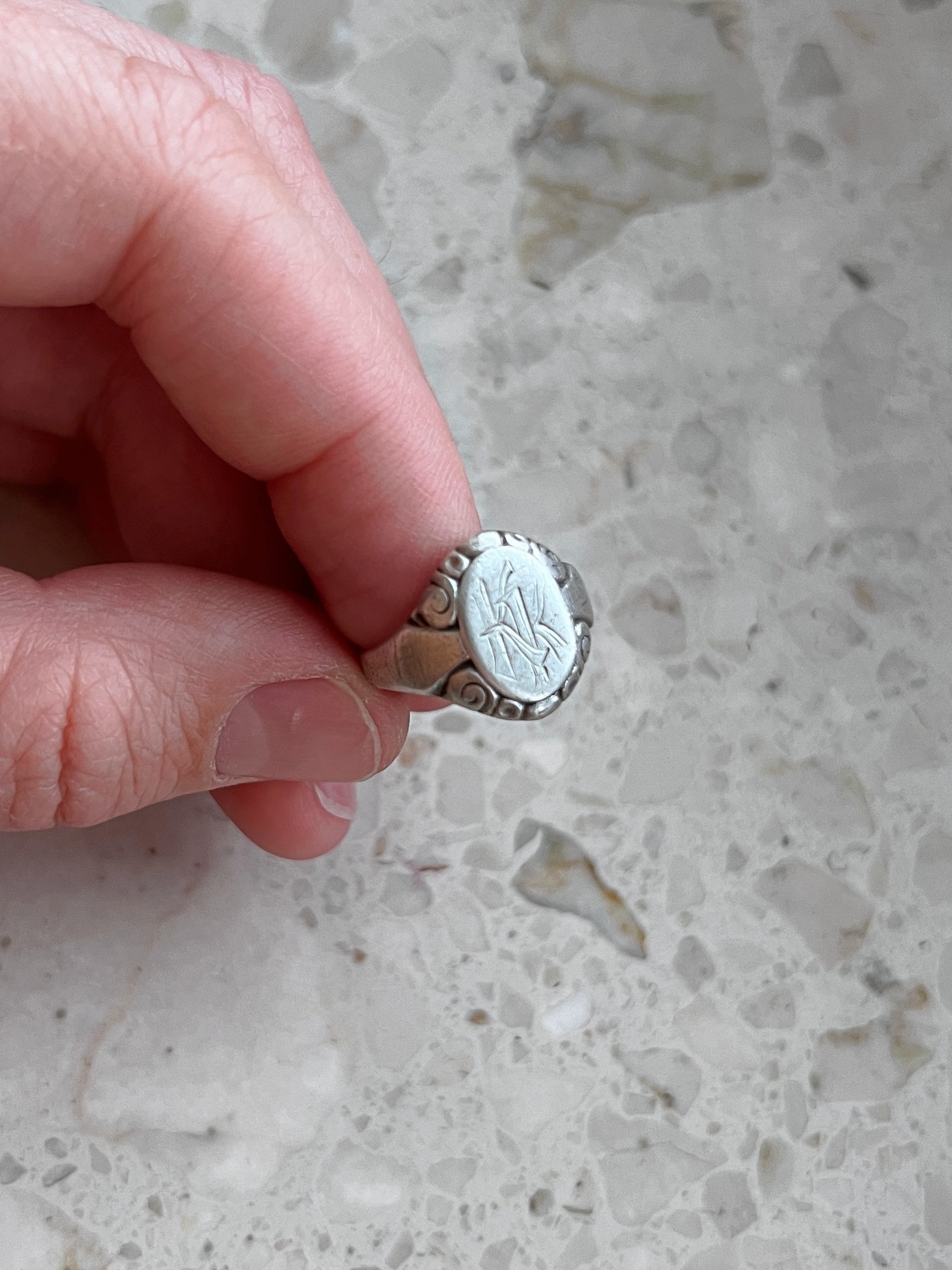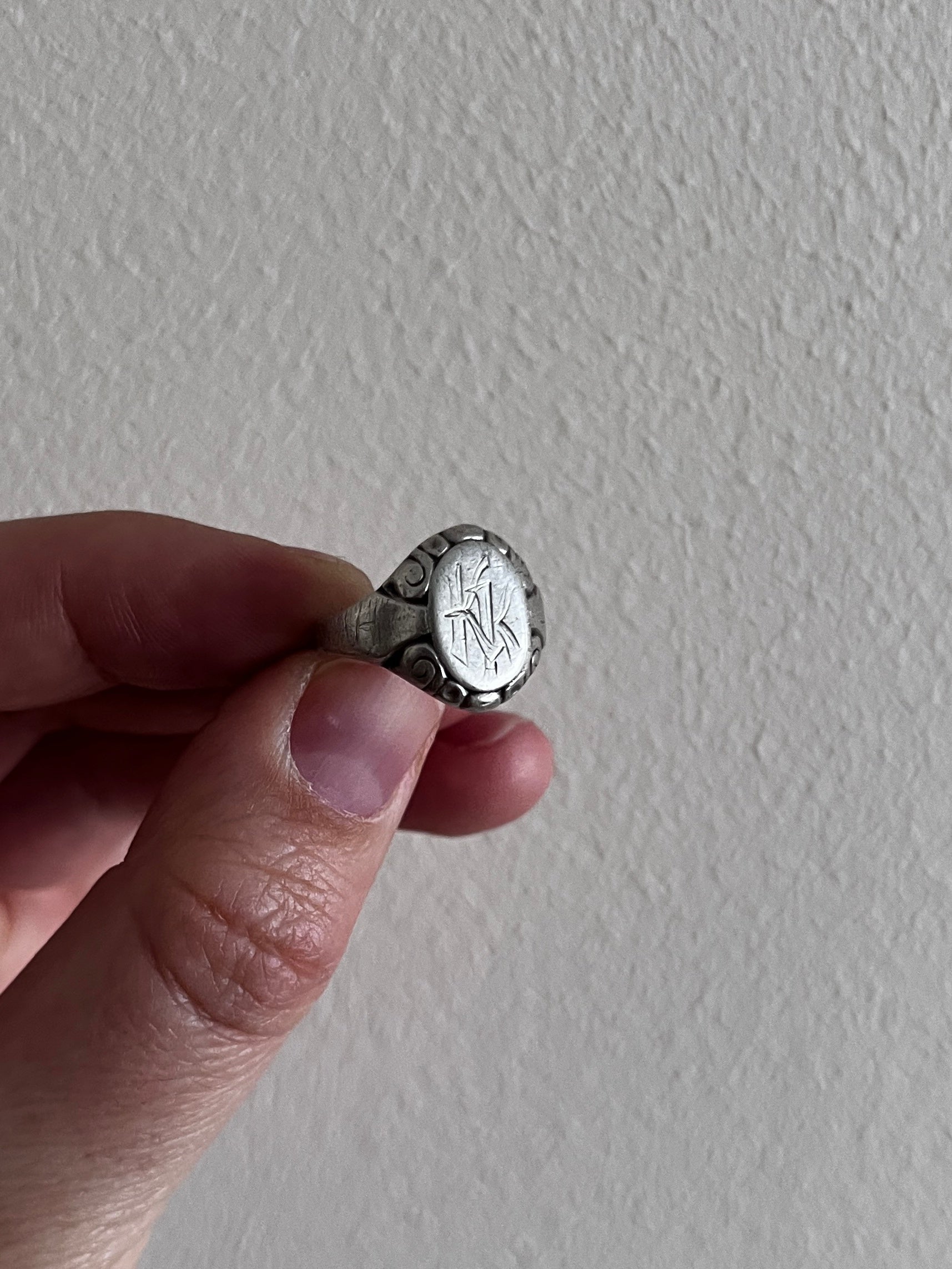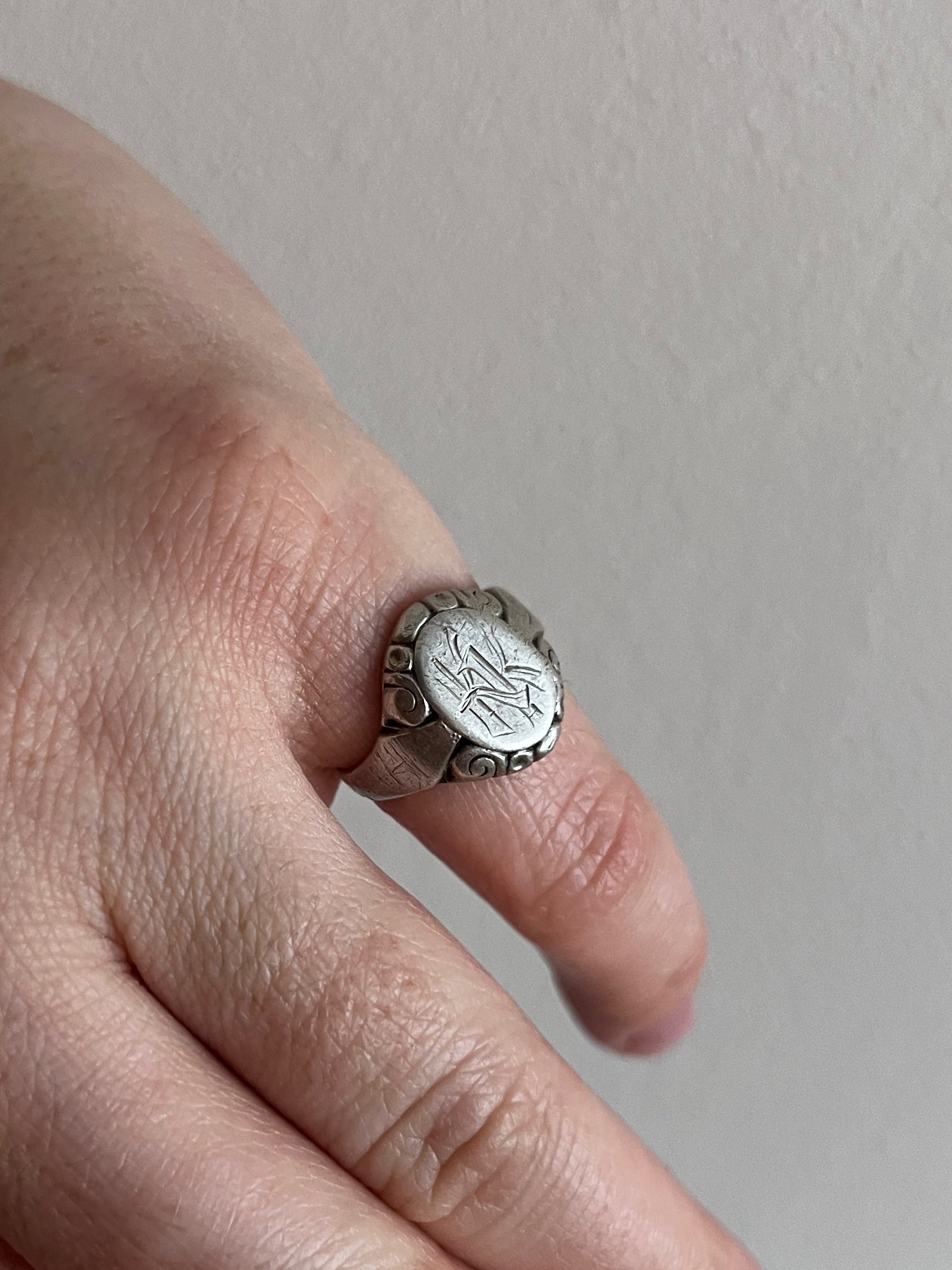 Ten srebrny sygnet z grawerowanymi inicjałami „KK” to biżuteria z duszą, która mogłaby z łatwością posłużyć za rekwizyt w powieści rodzinnej – symbol statusu, tożsamości i pamięci. Noszenie sygnetu z monogramem było niegdyś zarezerwowane dla osób świadomych swego nazwiska i dziedzictwa – to nie tylko ozdoba, ale forma komunikatu: „jestem częścią czegoś większego”. Próba 800 sugeruje jego powstanie w pierwszej połowie XX wieku, kiedy tego typu biżuteria wykonywana była ręcznie, z dużą precyzją i szacunkiem do rzemiosła.