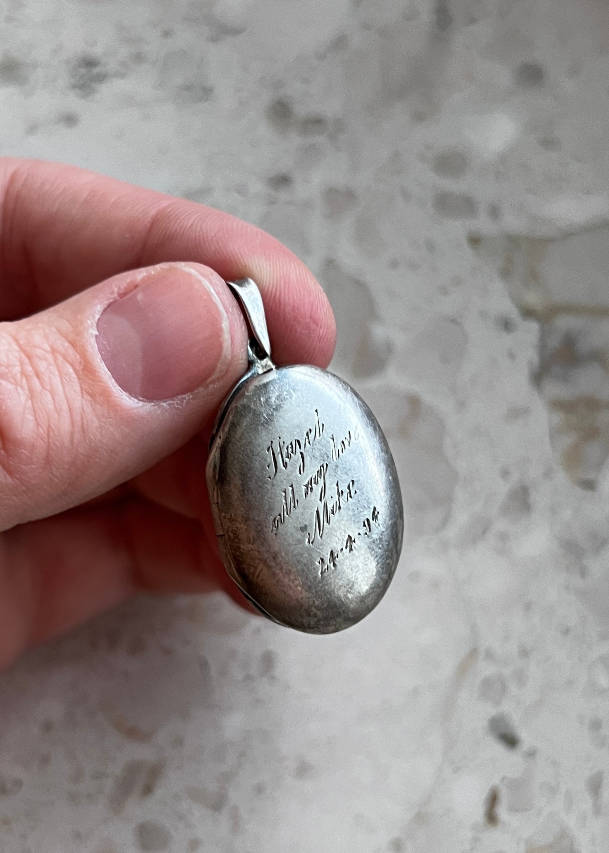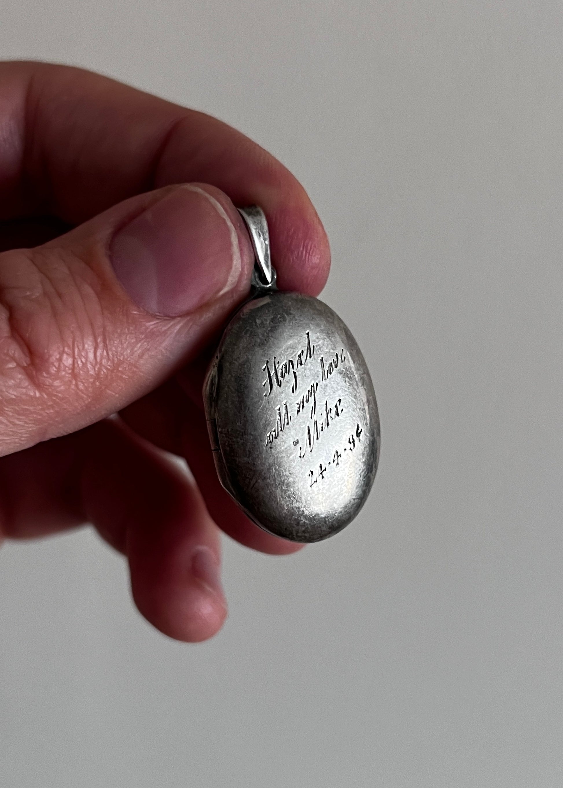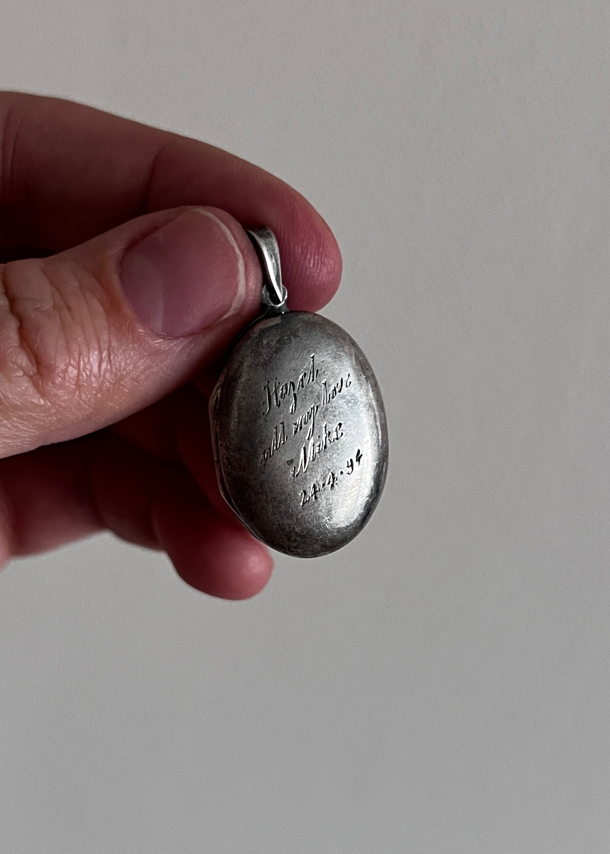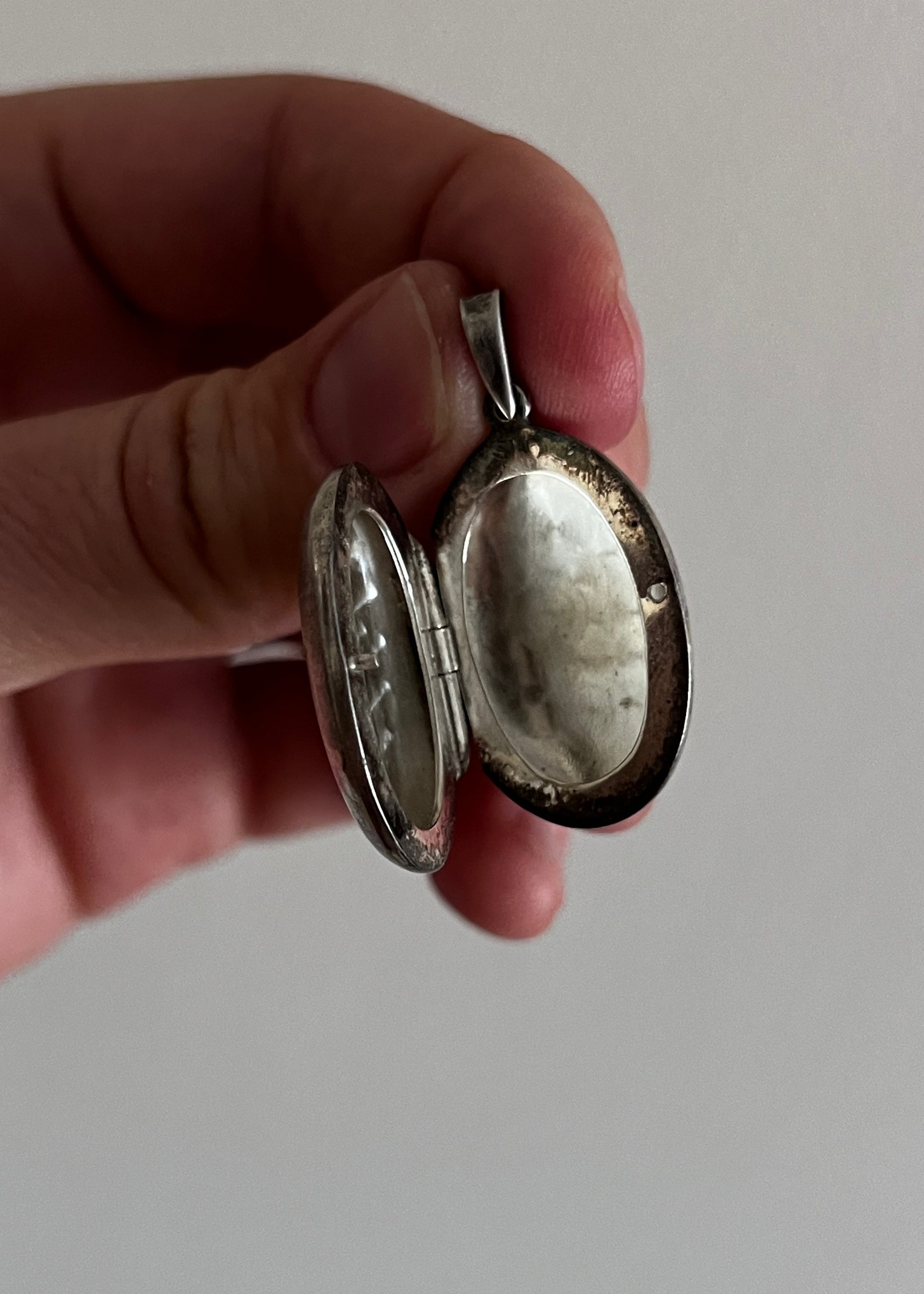 Medalion został wykonany ze srebra i ma klasyczny owalny kształt. Jego powierzchnia nosi subtelne ślady czasu – drobne przetarcia, naturalną patynę – które tylko dodają mu charakteru. To przedmiot noszony, bliski, emocjonalny.